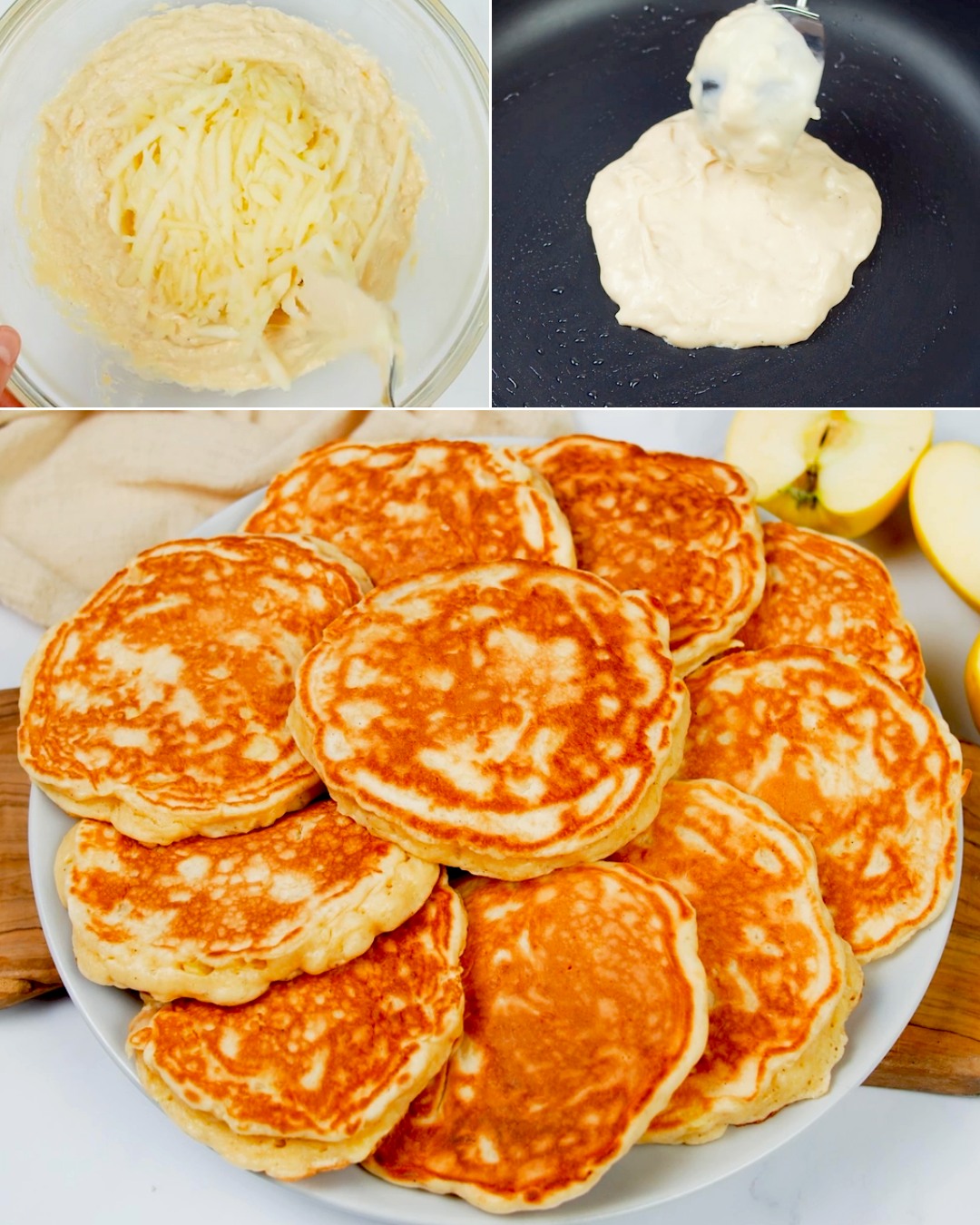 Hier zijn heerlijk luchtige en smaakvolle appelpannenkoekjes, het perfecte ontbijt om je dag te beginnen! Gemaakt met geraspte appels, warme kaneel en een vleugje vanille, deze pannenkoeken zijn een heerlijke variant op de klassieke ontbijtpannenkoek. Elke hap zit vol met de natuurlijke zoetheid van appels, met de zachtheid die je van pannenkoeken verwacht. Of je er nu van geniet op een luie zondagochtend of als een speciale doordeweekse traktatie, ze zijn gemakkelijk te maken (en nog gemakkelijker om te eten!). Waarschijnlijk heb je alle ingrediënten al in huis: appels, kaneel, yoghurt, bloem, suiker en bakpoeder. Maak eenvoudig een pasta, voeg geraspte appel toe en kook in een voorverwarmde pan. Ontbijt gemakkelijk gemaakt!