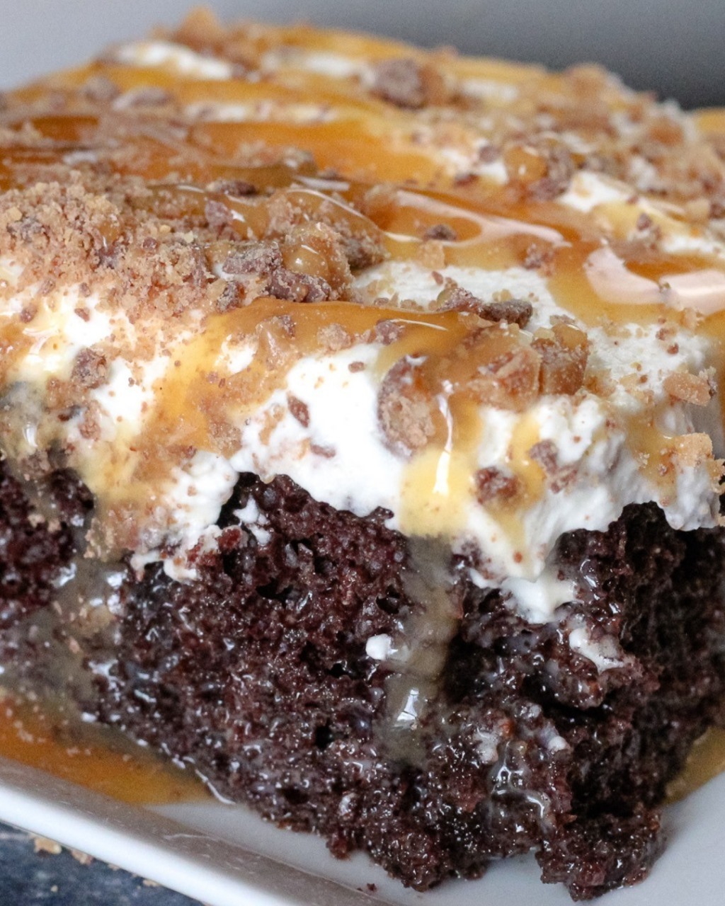 Deze chocoladetaart is een van die desserts die perfect zijn om cadeau te geven – want als je hem in huis hebt, kom je in de verleiding om hem helemaal op te eten! Rijk, decadent en uniek, deze versie valt op door een heerlijke mix van karamel, gecondenseerde melk en verkruimelde Heath-repen voor een crunch. De lichte slagroomtopping is de perfecte aanvulling op deze heerlijke traktatie.