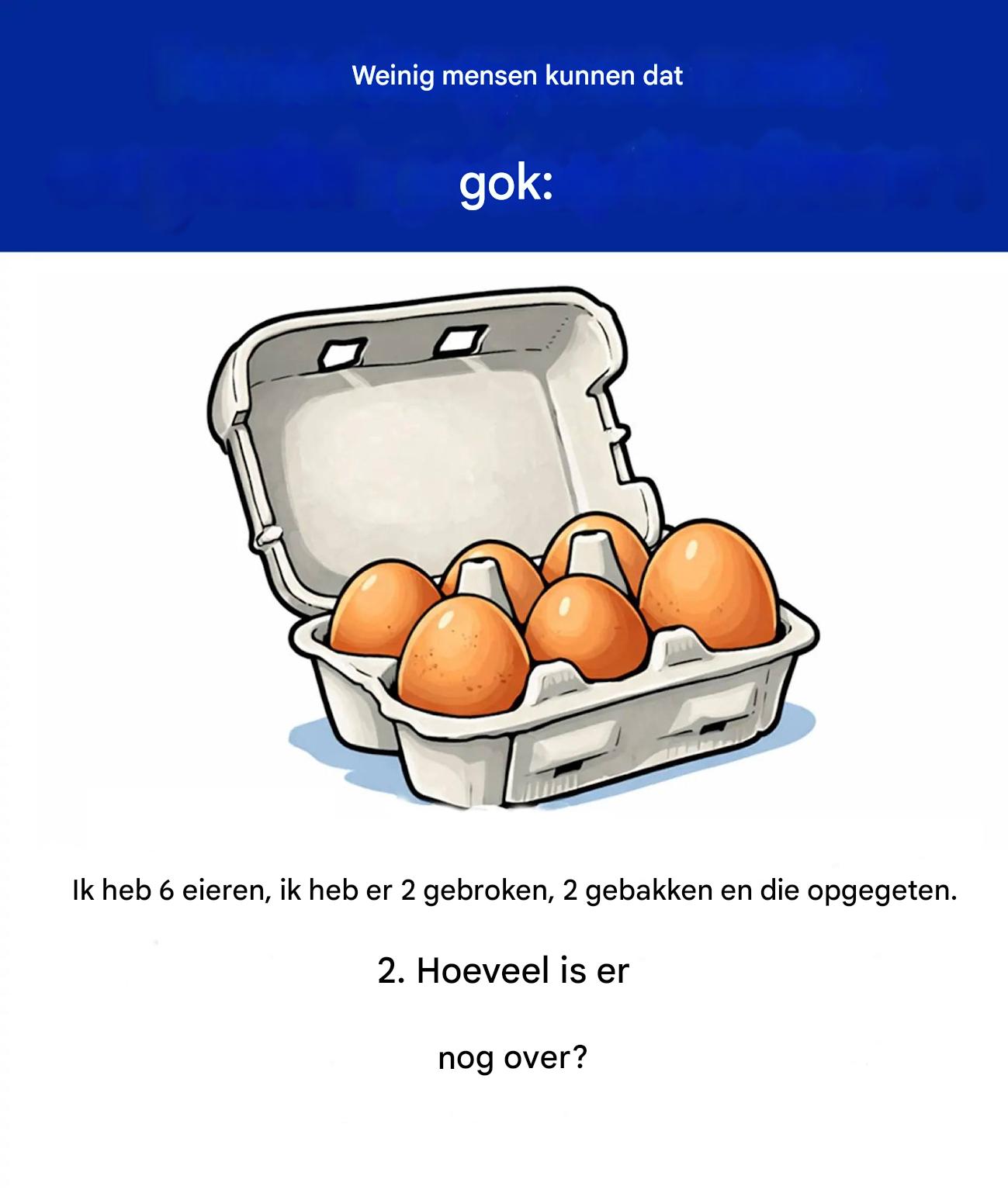 “Ik heb zes eieren. Ik heb er twee gebroken. Ik heb er twee gebakken. Ik heb er twee opgegeten. Hoeveel heb ik er nog over?”