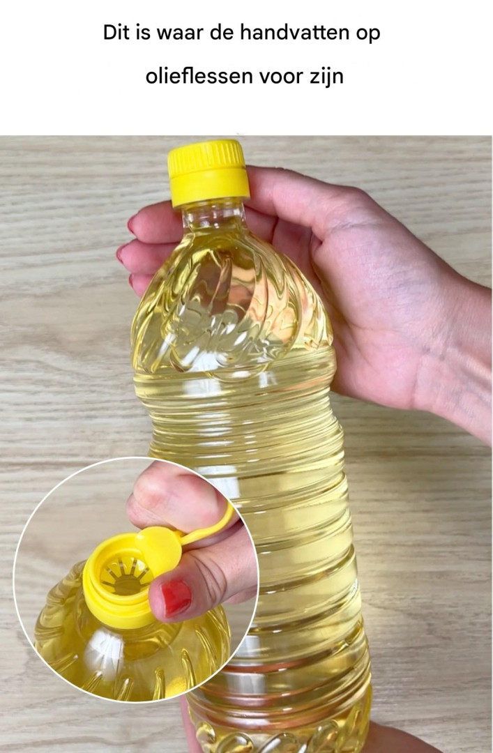 Hier komt de plastic dop om de hoek kijken. Een recente TikTok-video van @chaldomom liet een handige truc zien voor olijfolieflessen.