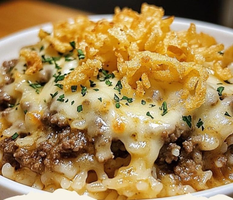 French Onion Ground Beef and Rice Casserole is een stevig en troostend gerecht dat de hartige smaken van gekarameliseerde uien, mals rundergehakt en luchtige rijst combineert. Doordrenkt met de rijkdom van Franse uiensoep en gegarneerd met gesmolten kaas en knapperige uien, is deze casserole perfect voor familiediners, potlucks of wanneer u zin heeft in een gezellige zelfgemaakte maaltijd.