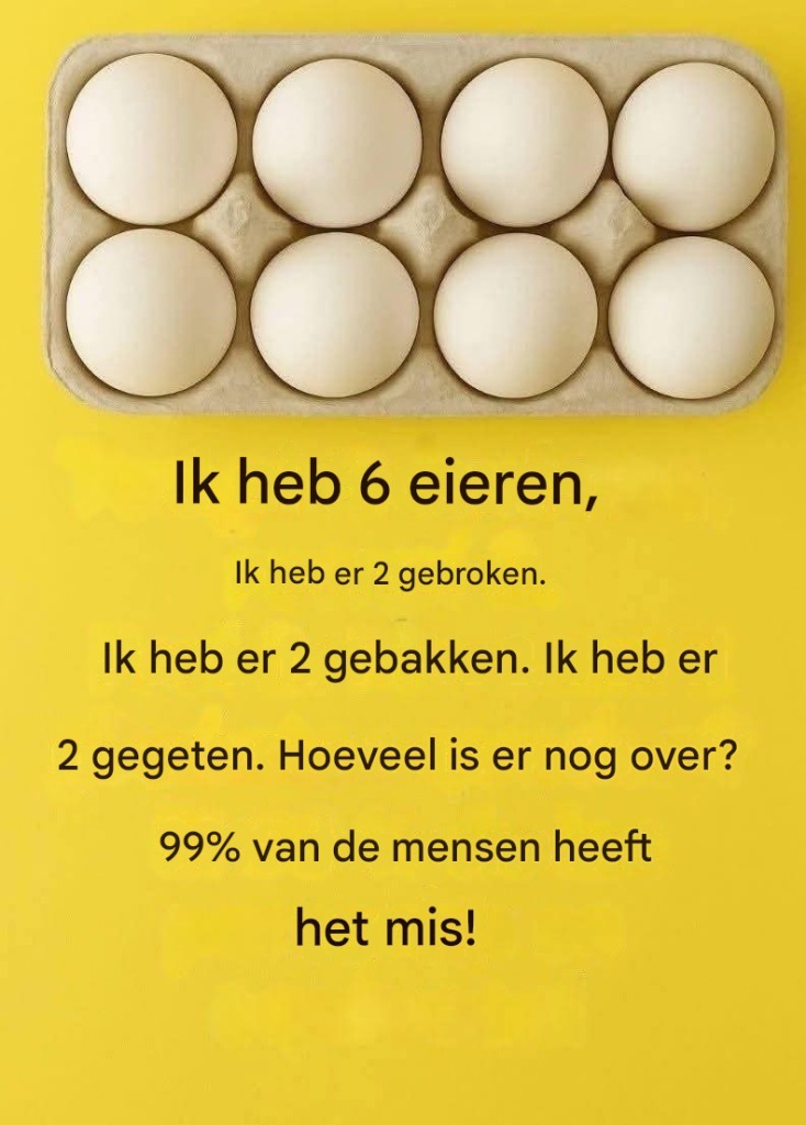 Als er dus maar 2 eieren zijn gebruikt voor de 3 acties (breken, bakken, eten), dan heb je: