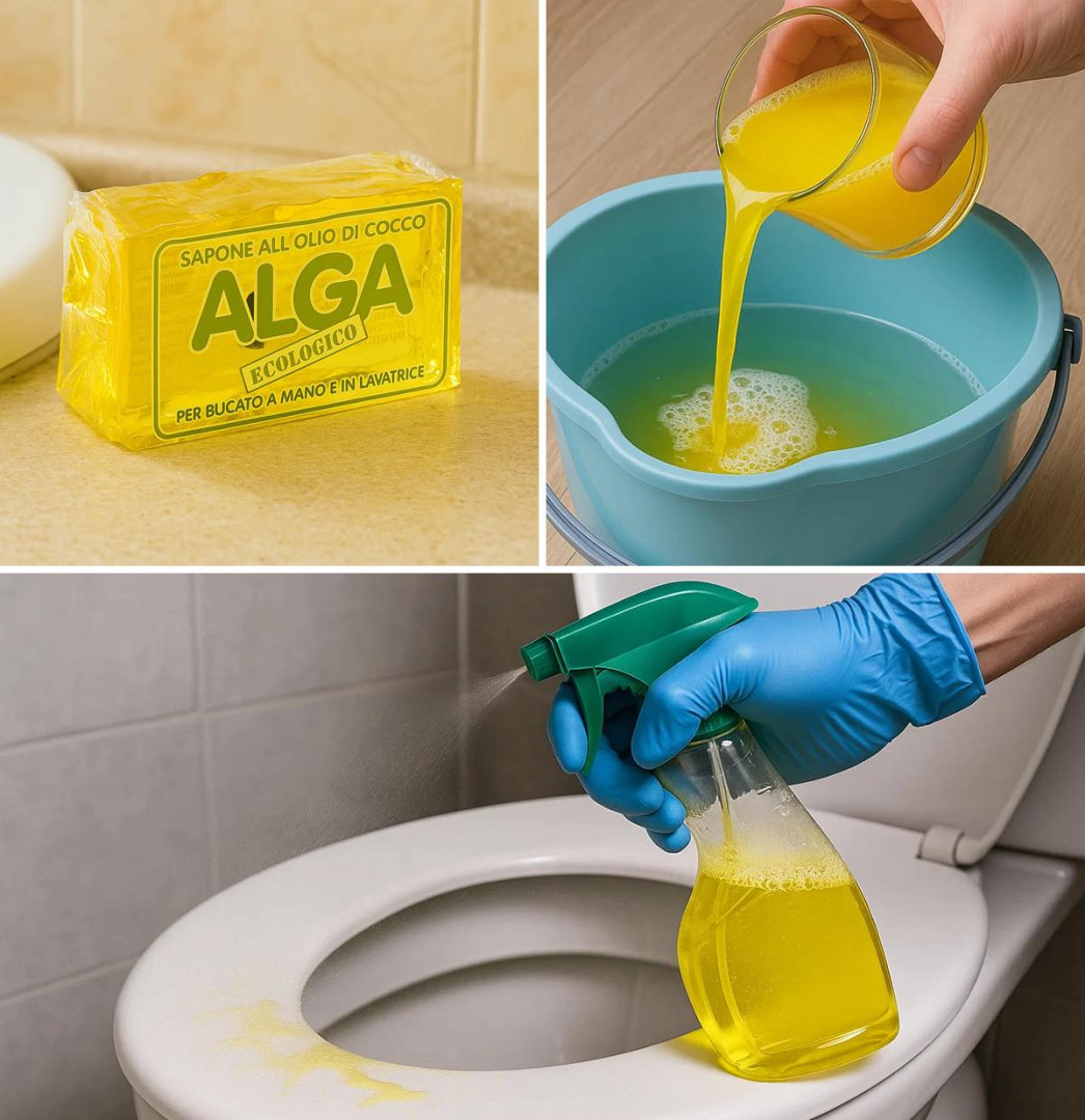 Gele zeep is gemaakt van kokosolie en is te koop in supermarkten, bijna altijd onder het merk « Alga ». Het is heel goedkoop en, zoals u zult zien, een uiterst veelzijdig en nuttig product voor huishoudelijke klusjes.
