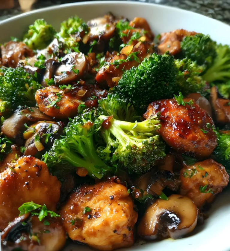 Als de kip mooi bruin is, is het de tijd om de groenten toe te voegen. Doe de fijngehakte knoflook in de pan en roer het een minuutje door, zodat de smaak vrijkomt. Dan voeg je de broccoliroosjes en de champignonteen toe. Bak dezelfde nacht gedurende 5-7 minuten. Van de broccoli tot de geurige paddenstoelen, je vindt de rode biet en de paddenstoelen zullen hartig blijken te zijn. Je zult die geweldige crunch behouden, dus zorg ervoor dat je niet te lang bakt!