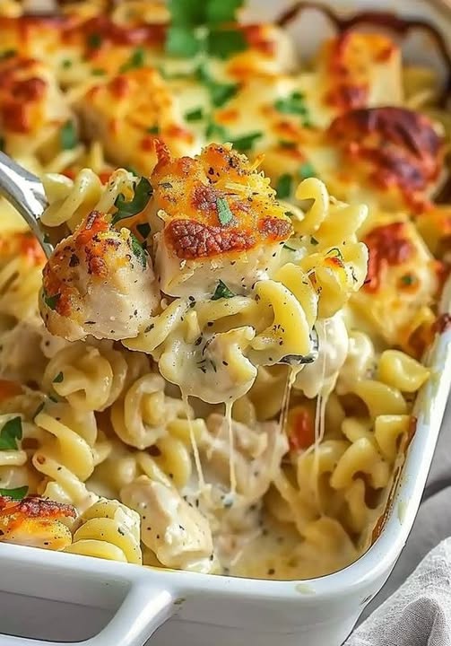 Deze verfijnde pasta-kipschotel combineert de rijke Italiaanse keukentraditie met moderne gemakskeuken. Het gerecht vindt zijn oorsprong in de ‘pasta al forno’ uit Noord-Italië, waar ovenschotels vaak werden bereid om restjes smaakvol te verwerken. Mijn versie verheft dit concept naar een hoger niveau met een perfect uitgebalanceerde combinatie van romige saus, malse kip en een onweerstaanbaar krokante topping.