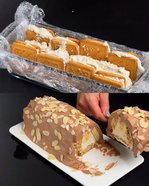 No-bake dessert met kwark, banaan en koekjes