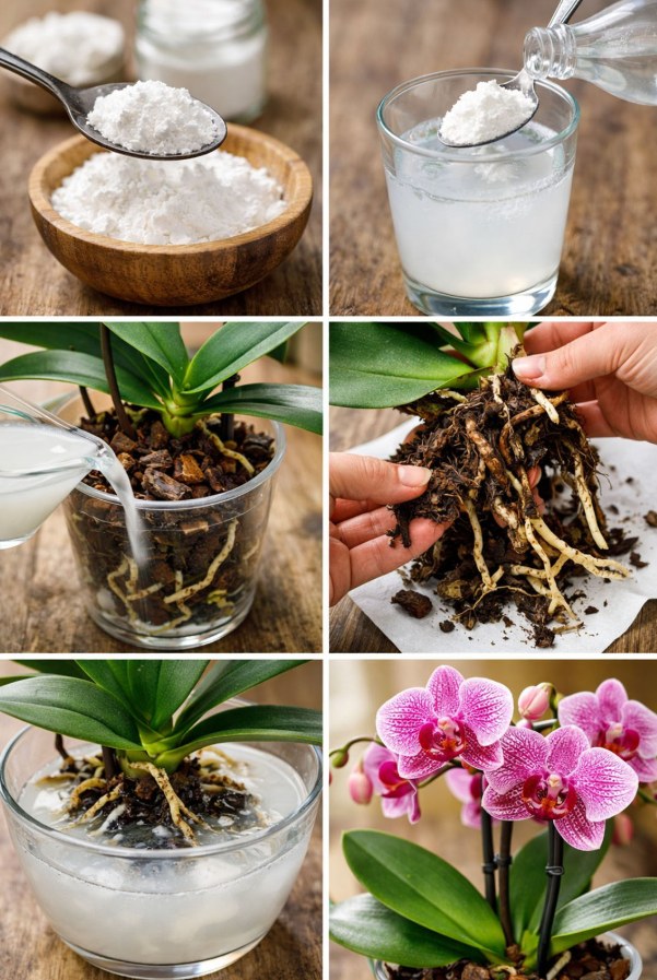 Hier komt de favoriete truc van veel plantenliefhebbers om de hoek kijken: maïzena. Ja, dit discrete ingrediënt in onze kasten kan een echte bondgenoot worden voor je orchideeën. Natuurlijk en gemakkelijk in gebruik helpt het de plant zijn wortels te versterken en de luchtvochtigheid beter te reguleren, zonder het gebruik van chemicaliën.
