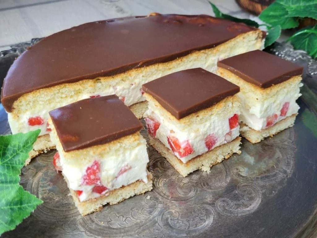 Traditionele biscuittaart met slagroom, chocolade en aardbeien.