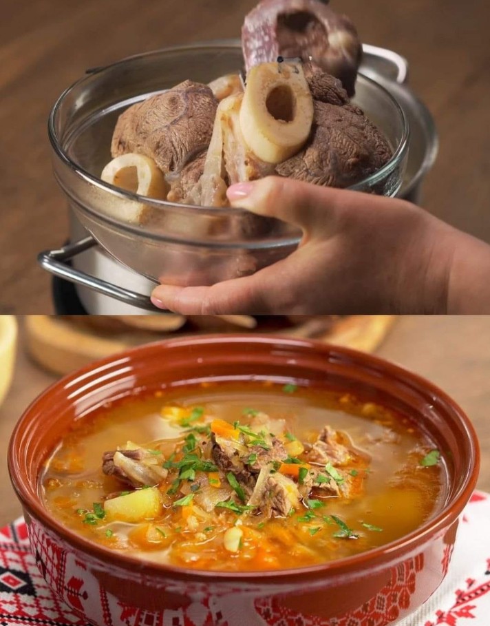 Zodra het rundvlees gaar is, haal je het uit de pan. Zeef de bouillon en zet ze apart. Je kunt het vlees van het bot halen en apart leggen voor later gebruik in de soep.