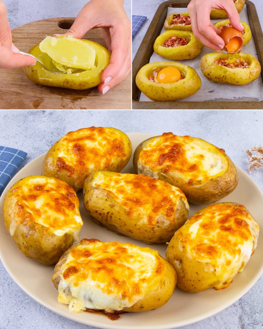 Tweemaal gebakken gevulde ontbijtaardappelen met ei